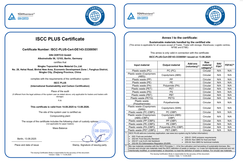 ISCC(International Sustainability and Carbon Certification)是一个全球适用的可持续发展认证体系,通过其ISCC PLUS标准,为包括回收碳材料在内的各类生物基和循环经济材料提供认证,确保其在整个供应链中的环境友好性、社会负责性和可追溯性。