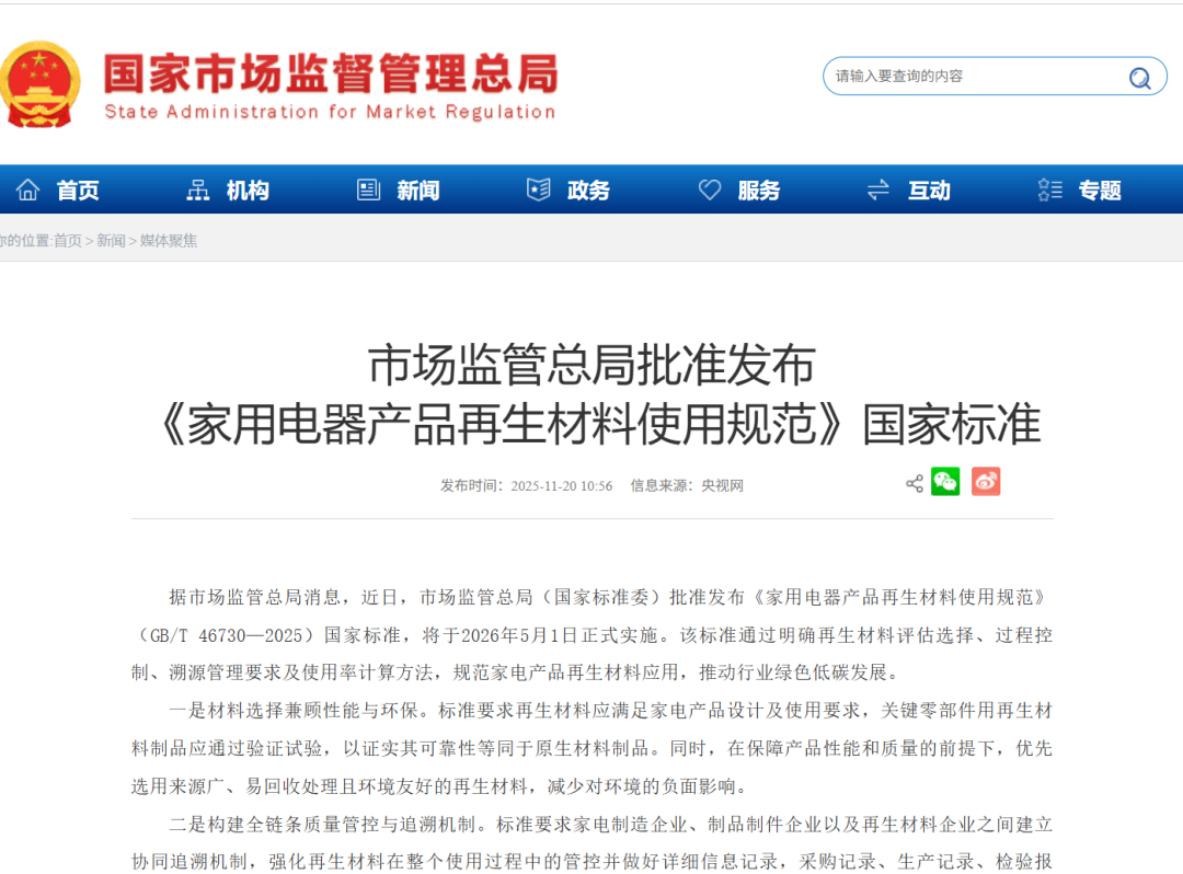 近日,市场监管总局(国家标准委)批准发布《家用电器产品再生材料使用规范》(GB/T 46730—2025)国家标准,将于2026年5月1日正式实施。该标准通过明确再生材料评估选择、过程控制、溯源管理要求及使用率计算方法,规范家电产品再生材料应用,推动行业绿色低碳发展。