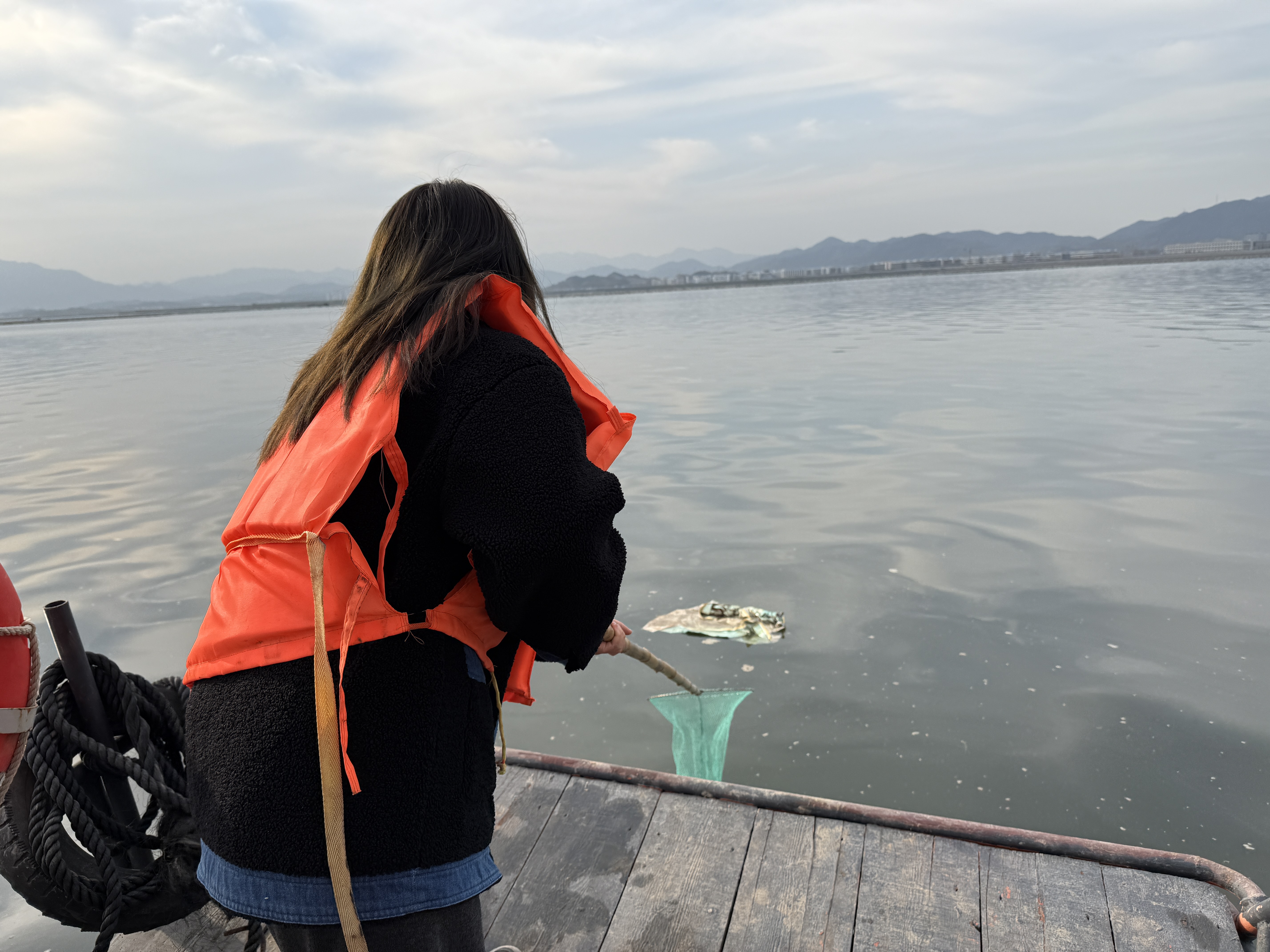 随后志愿者与工作人员共同登上船只,开展近海漂浮垃圾清理作业。 行动队沿着海岸线缓缓航行,目光专注地扫视海面。很快,他们发现了第一批目标——随着潮水起伏的塑料瓶、泡沫碎片和废弃渔网。