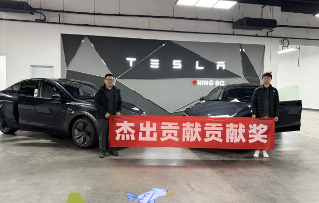 近日,宁波坚锋新材料有限公司为表彰2024年度做出杰出贡献的员工,以非同凡响的方式回馈他们的辛勤付出与卓越成就-特别奖励每人一辆特斯拉Model Y新能源汽车。获奖员工在大家的见证下喜提新车。这一举措不仅彰显了公司对人才的高度重视,也激励着全体员工向更高的目标迈进。